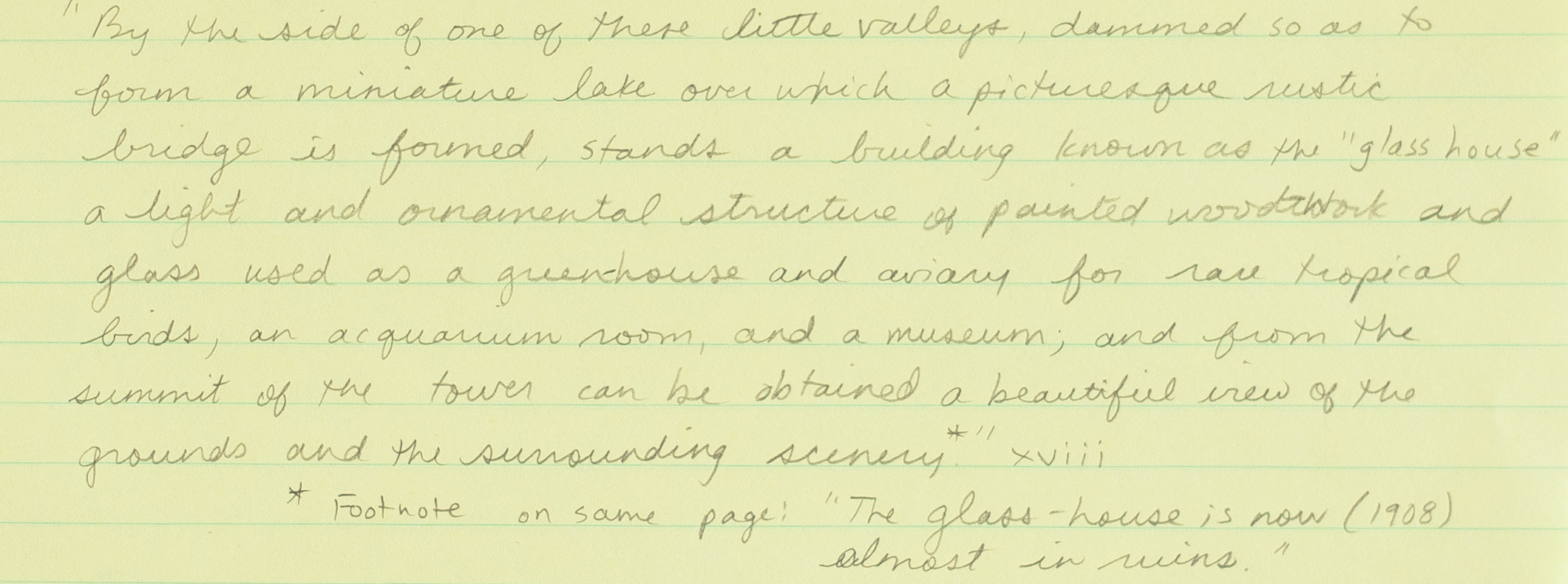 This structure was known (and is remembered) as “The Glass House”, particularly notable as nobody lived there; instead it was home to the captive eagles, falcons, owls, and other stilled birds mounted on severed branches, or displayed in brass cages. Constructed out of wood and glass, there is a certain airiness to the structure, a fragility. Ultimately, the building was vulnerable— perhaps due to moisture of the brook running through it, or perhaps due to the questionable ability of its materials to withstand the elements. Over the years, the building crumpled and disintegrated into the earth. In 1908, Major-General Campbell Hardy (also an artist, naturalist, and a dear friend of Andrew Downs), wrote: